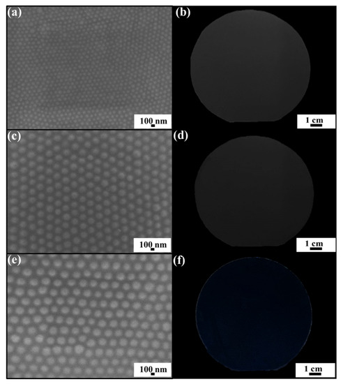 Top-view SEM images and photos of PET substrates coated with non-close-packed (a,b) 80 nm silica colloidal crystals, (c,d) 130 nm silica colloidal crystals, and (e,f) 180 nm silica colloidal crystals.