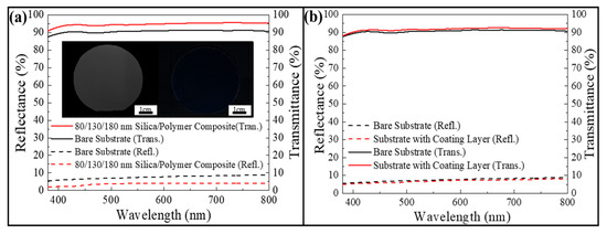 (a) Optical reflection spectra and optical transmission spectra in the visible wavelength region acquired from the PET substrates. Inserts showing photos of a bare PET substrate (left) and a randomly arranged 80/130/180 nm silica colloid-coated PET substrate (right). (b) Optical reflection spectra and optical transmission spectra in the visible wavelength region acquired from a bare PET substrate and a poly(ETPTA) layer-coated PET substrate.