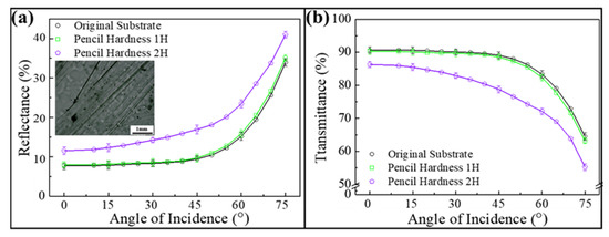 (a) Average reflectances and (b) average transmittances in the visible spectrum acquired from bare PET substrates after pencil hardness tests at varied angles of incidence. Insert showing an optical micrograph of a bare PET substrate after scratching with a 2H pencil.