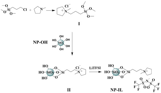 Modification of silica particles was adopted from previously reported procedures [35] and the preparation route is schematically presented in Figure 2. Initially N-[3-(trimethoxysilyl)propyl]-N-methylpyrrolidinium chloride (I) was synthesized from N-methylpyrrolidine and (3-chloropropyl)trimethoxysilane (detailed description of the synthesis procedure can be found in the supporting information). In a typical modification of silica nanoparticles Ludox-sm® (3 g) was diluted using deionized water (100 g) and 0.7 g (2.5 mmol) of (3-chloropropyl)trimethoxysilane were added to the solution. The mixture was kept stirring at 80 °C for 24 h. Solutions containing the modified nanoparticles (II) were concentrated using a rotary evaporator and precipitated into acetone. NPs were collected using centrifugation and washed with acetone three more times. For obtaining the final modified particles with TFSI anion a simple anion exchange reaction was conducted via the following procedure: II was dissolved in 35 mL deionized water and mixed with 10 mL of a solution containing 1 g (3.5 mmol) LiTFSI. The mixture was kept stirring for 8 h, after which the final product (NP–IL) was collected via centrifugation and washed several times with deionized water. NP–ILs were dried under vacuum at 70 °C and stored in a desiccator over P2O5.