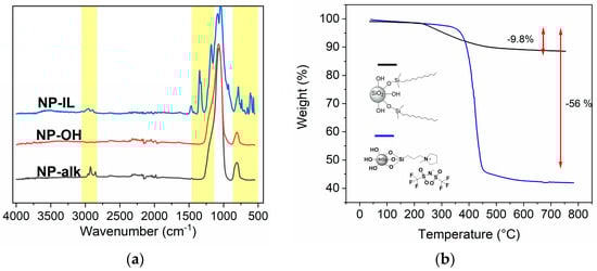 (a) FT–IR spectra of nanoparticles NP–IL (blue), NP–OH (red) and NP–alk (black); (b) TGA thermograms of NP–Alk (black) and NP–IL (blue).