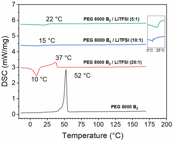 Differential scanning calorimetry (DSC) results of PEG 8000 B2 without any additives and PEG 8000 B2 with different amount of mixed LiTFSI (20:1(10), 10:1 (9), 5:1 (8)).
