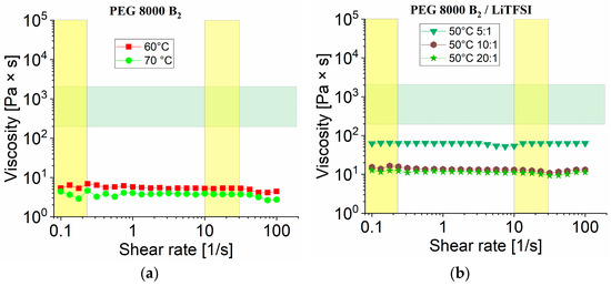 Rheology measurements viscosity vs. shear rate for (a) PEG 8000 B2 at 60 °C and 70 °C; (b) PEG 8000 B2 mixed with LiTFSI (EO/Li 5:1 (8), 10:1 (9), 20:1 (10)) at 50 °C.