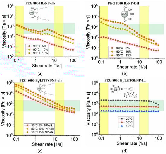 Rheology measurement of viscosity vs. shear rate for (a) PEG 8000 B2 mixed with NP–alk (5% (15), 10% (16), 15% (17)) at 90 °C; (b) PEG 8000 B2 mixed with NP–OH (5% (18), 10% (19), 15% (20)) at 90 °C; (c) PEG 8000 B2 mixed with LiTFSI (5:1) and NP–alk (5% (11), 10% (12), 15% (13)); (d) PEG 8000 B2 mixed with NP–IL (5% (14)).