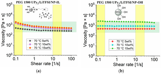 Rheology measurement of viscosity vs. shear rate for (a) PEG 1500 UPy2/LiTFSI mixed with NP–IL (5% (2), 10% (3), 15% (4)) at 70 °C; (b) PEG 1500 UPy2/LiTFSI mixed with NP–OH (5% (5), 10% (6), 15% (7)) at 70 °C.