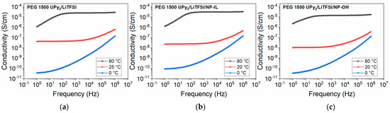 DC conductivity was extracted from the DC plateau of the frequency vs. conductivity plots obtained from BDS measurements. The DC conductivities for the samples at the temperature 0 °C are not extracted (except PEG 8000 B2/LiTFSI mixture (EO:Li 10:1)) due to the considerable overlap of electrode polarization with the DC plateau. PEG 1500 UPy2 mixed with LiTFSI showed conductivities up to 2.8 × 10−5 S/cm at 80 °C (Figure 9a). The same sample with additional nanofillers (composition 4 and 7) also exhibits conductivity in a similar range. NP–OH addition led to conductivity up to 1.7 × 10−5 S/cm at 80 °C, while addition of the surface modified NPs (NP–IL) led to slightly increased conductivities of up to 3.2 × 10−5 S/cm at 80 °C. This indicates that modification of the surface with the ionic groups may positively influence the conductivity of such composite electrolytes.