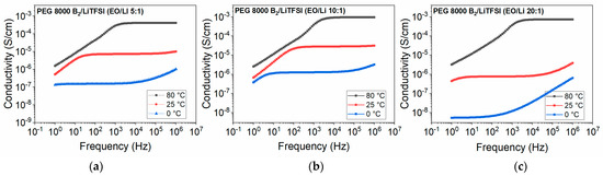 Frequency dependent ionic conductivity of (a) PEG 8000 B2/LiTFSI mixture (EO:Li 5:1) (8); (b) PEG 8000 B2/LiTFSI mixture (EO:Li 10:1) (9); (c) PEG 8000 B2/LiTFSI mixture (EO:Li 20:1) (10).