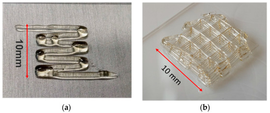 3D printing attempts of (a) PEG 1500 UPy2/LiTFSI (EO:Li 5:1)(1); (b) PEG 1500 UPy2/LiTFSI (EO:Li 5:1) mixed with 15% NP–IL (4).