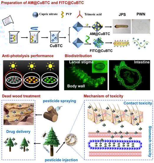 Pine wilt disease is a devastating forest disaster caused by Bursaphelenchus xylophilus, which has brought inestimable economic losses to the world’s forestry due to lack of effective prevention and control measures. In this paper, a porous structure CuBTC was designed to deliver avermectin (AM) and a control vector insect Japanese pine sawyer (JPS) of B. xylophilus, which can improve the biocompatibility, anti-photolysis and delivery efficacy of AM. The results illustrated the cumulative release of pH-dependent AM@CuBTC was up to 12 days (91.9%), and also effectively avoided photodegradation (pH 9.0, 120 h, retention 69.4%). From the traceable monitoring experiment, the AM@CuBTC easily penetrated the body wall of the JPS larvae and was transmitted to tissue cells though contact and diffusion. Furthermore, AM@CuBTC can effectively enhance the cytotoxicity and utilization of AM, which provides valuable research value for the application of typical plant-derived nerve agents in the prevention and control of forestry pests. AM@CuBTC as an environmentally friendly nanopesticide can efficiently deliver AM to the larval intestines where it is absorbed by the larvae. AM@CuBTC can be transmitted to the epidemic wood and dead wood at a low concentration (10 mg/L).