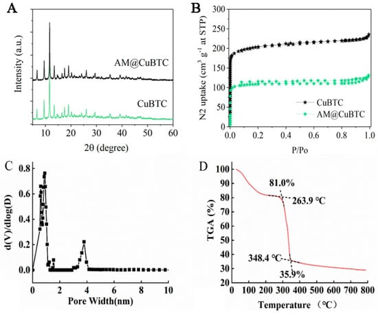 The XRD and BET of CuBTC and AM@CuBTC (A,B); mesoporous distribution of CuBTC (C), and TGA (D) of CuBTC.