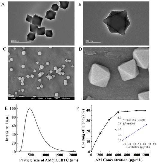 Figure 2A shows the XRD of CuBTC and AM@CuBTC; it can be seen from the X-ray diffraction pattern that the peak positions of the characteristic peaks of AM@CuBTC were basically consistent with those of the CuBTC curve, indicating that the purity and crystallinity of the samples obtained were close to CuBTC, and free AM did not change the structure of CuBTC during the process of adsorption. From Figure 2B, CuBTC had excellent adsorption properties because of its open unsaturated copper metal sites, which brought opportunities to absorb the AM. After loading the AM, the porosity of CuBTC decreased, indicating that AM occupied most of the pores. The pore size distribution showed that CuBTC was a microporous structure between 0–2 nm to 3–4 nm (Figure 2C). The changes in thermal weight loss of AM@CuBTC were observed through the thermal weight loss curve (Figure 2D). The quality of AM@CuBTC reduced by 19% in the heating range of 0–300 °C, which may be due to the decomposition of AM. Figure 3A–D shows the TEM and SEM images of AM@CuBTC and a single enlarged image, the dynamic diameter of AM@CuBTC was about 350 nm and of uniform particle size (Figure 3E).