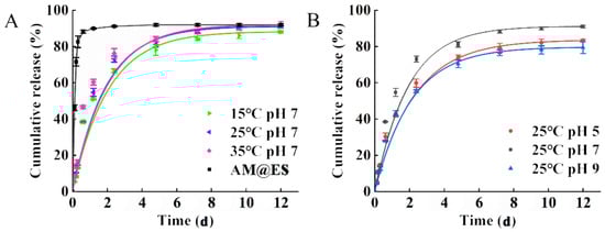 (A) The release curve of avermectin @CuBTC at 15 °C, 25 °C and 35 °C with pH of 7.0, and avermectin @ES as a control; (B) the release curve of avermectin @CuBTC with pH of 5.0, 7.0 and 9.0 at the temperature of 25 °C.