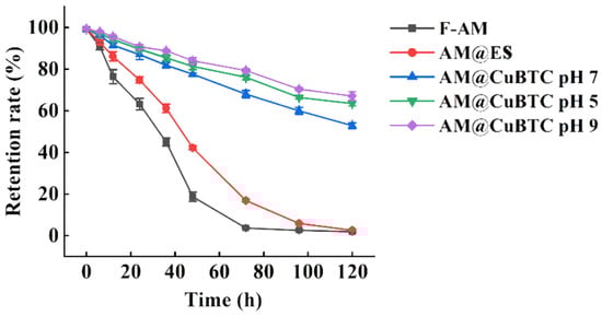 The structure of the conjugated double bond and the 16-membered ring macrolide structure made AM easy to degrade under light [,]. So, it is necessary to consider the anti-photolysis effect of CuBTC on the AM when preparing AM@CuBTC. The retention curve of AM exposed to ultraviolet light clarified the protective effect of AM@CuBTC on AM (Figure 5). By comparison, it can be observed that the retention rate of each treatment group decreased with the extended treatment time under the condition of ultraviolet light irradiation. After 72 h, the retention rate of the free AM was less than 5%, and the AM@ES treatment group was only about 15%, while the AM@CuBTC treatment group was still more than 70%. The possible explanation is that as AM@CuBTC gradually released AM after treatment, the released AM was degraded, resulting in a decrease in retention rate, indicating that CuBTC could effectively protect AM from photolysis. In addition, the retention rates of the AM@CuBTC at pH 5.0 and 9.0 after 120 h were 62.2 and 69.4%, respectively. Obviously, the weak degradation of CuBTC under acidic conditions promoted the release of AM with the prolongation of the treatment time, and increased the photolysis rate, and then reduced the retention rate of AM. The excellent anti-photolysis performance of AM@CuBTC was mainly attributed to its porous structure, and AM was absorbed on the pores inside CuBTC during the preparation of AM@CuBTC, which naturally shielded it from exposure to ultraviolet light.