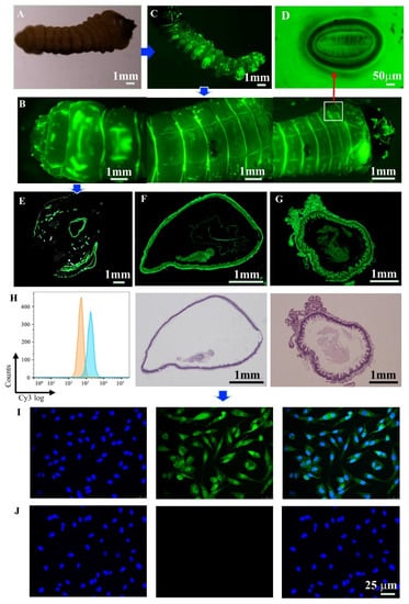 Fluorescence distribution of JPS larva after treatment with FITC@CuBTC (B), JPS larva without fluorescence treatment as a control (A); abdominal fluorescence distribution of JPS larvae (C); magnified image of larval stigma (D); (E) fluorescence distribution of the middle cross section of JPS larva; (F) fluorescence distribution image of the midgut cross section and HE staining; (G) fluorescence distribution image of foregut cross section and HE staining; (H) the uptake rate of FITC@CuBTC was detected by flow cytometry. (I) The cellular uptake of FITC@CuBTC to DF-1 cells (green), DAPI stains the nucleus (blue), and merge image; (J) the cellular uptake of CuBTC to DF-1 cells (green), DAPI stains the nucleus (blue), and merge image.