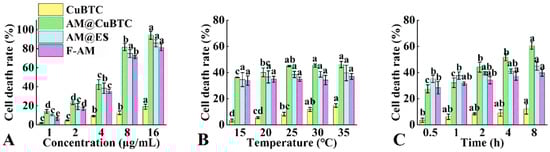 The cell death rate of CuBTC, avermectin @CuBTC, avermectin @ES, and free avermectin with different concentrations (A), temperatures (B), and treatment times (C). Data in the figure mean ± SD of three replications (n = 3), different letters indicate significant differences (ANOVA, p < 0.05).