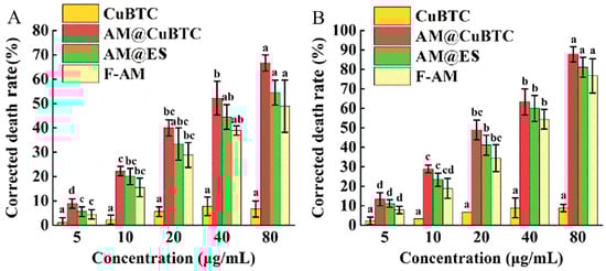 The contact toxicity of CuBTC, free avermectin, avermectin @ES and avermectin @CuBTC at 48 h (A), and the stomach toxicity at 48 h (B). Data in the figure are mean ± SD of three replications (n = 3), different letters indicate significant differences (ANOVA, p < 0.05).