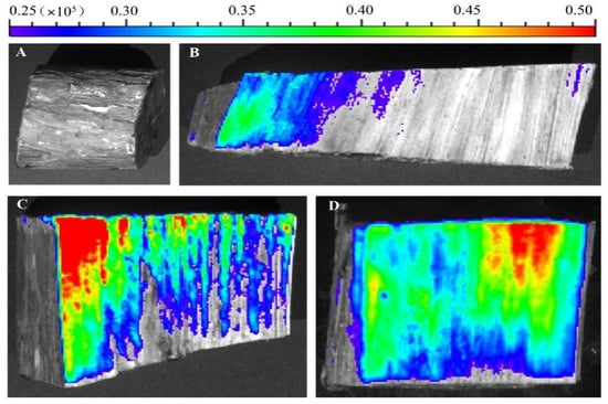 Tree trunks injected with water (A), fluorescence distribution along the pith direction after 1 h (B), fluorescence intensity along the pith direction after 5 h (C), fluorescence intensity along the pith direction after 24 h (D).