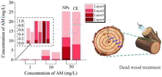 What is the reason for this phenomenon? We speculated that the rate of water transport along the pith was different, the closer to the pith tree, the faster the water transport, and the greater the pesticide concentration difference between inside and outside, which led to the continuous transport of FITC@CuBTC to the pith (Figure 10). This would also inhibit the irreversible damage caused by the migration of nematodes to the middle of the tree, indicating that AM@CuBTC would effectively protect the main part of the tree from pests. The treatment of dead wood was also very important during transportation. [,,]. In this article, AM@CuBTC was injected into dead wood and sprayed AM@CuBTC (adhesion of nanoparticles) on the bark surface to seal the dead wood. It can be seen from Figure 11 that AM@CuBTC could also be transmitted in dead wood. However, the transmission efficiency in dead wood at the same concentration was much lower than that of epidemic wood, and the same was true for AM@ES transmission. This phenomenon can be understood as the basic stagnation of the water transport in dead wood, the delivery of AM@CuBTC is blocked, and efficient diffusion cannot be achieved in dead wood; the only water remaining in the dead wood provided effective support for the delivery of AM@CuBTC, which was also based on the good diffusion performance of CuBTC to promote the further transmission of AM@CuBTC.
