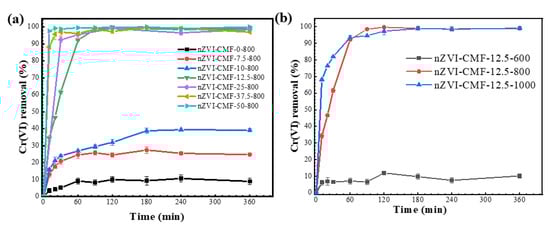 It is well known that the carbonization temperature could remarkably affect nZVI formation [36]. The sample carbonized at 600 °C indicated a rather low Cr(VI) removal of about 12% (Figure 1b), similar to that of the control sample without Fe3+, suggesting that nZVI could not be formed at this temperature. It has been reported that Fe3+ reduction to Fe0 requires a specific temperature and sufficient carbon. Generally, Fe3O4 tends to form at relatively low temperatures (e.g., 500 °C), whereas Fe0 amounts increase gradually with temperature [37,38]. The samples produced at 800 °C and 1000 °C displayed significant Cr(VI) removal efficiency with a slightly greater initial removal rate at the higher temperature. From the perspective of energy consumption, 800 °C was selected as the optimum carbonization temperature.