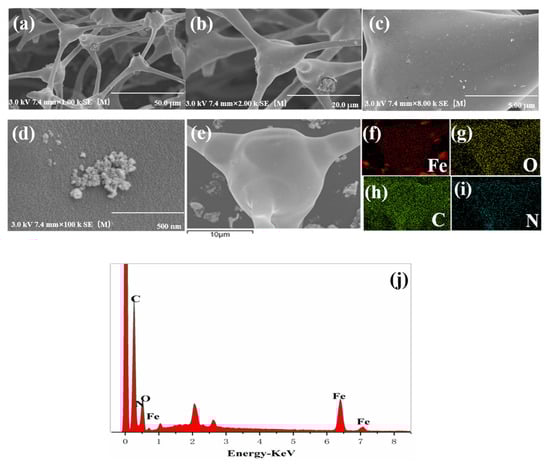 Characteristics: SEM images of (a) Fe@MF-12.5-800 (×1000), (b) Fe@MF-12.5-800 (×2000), (c) Fe@MF-12.5-800 (×8000) and (d) Fe@MF-12.5-800 (×100,000). (f–i) SEM-EDS elemental distribution mapping of Fe, O, N and C obtained from (e). (j) The EDS survey of Fe@MF-12.5-800.