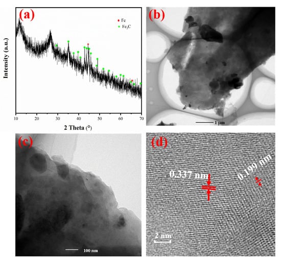 The XRD spectrum of Fe@MF-12.5-800 (Figure 3a) evidenced its crystallographic structure. Those distinct peaks occurring at 44.8° and 65.1° corresponded to the Bragg plane of (110) and (200) of Fe0 (JCPDS No. 65-4899) [40]. Furthermore, peaks occurring at 26.41, 37.65, 39.82, 40.65, 42.89, 43.76, 45.88 and 49.13° corresponded to the Bragg planes of (020), (210), (002), (201), (211), (102), (112) and (221), respectively, which were in high accordance with Fe3C (JCPDS No. 65-2411) [41,42]. Hence, the main components of Fe@MF-12.5-800 were Fe3C and Fe0, which is in line with the results of Gao et al. [7]. Also, the TEM images in Figure 3b,c illustrate a significant number of particles randomly dispersed within the carbonized melamine foam. Figure 3d displays the HRTEM image with a lattice spacing of 0.199 and 0.337 nm, which corresponds to the (110) crystal plane of Fe0 and (211) crystal plane of Fe3C [41,42].