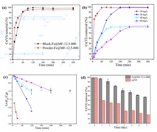 The rate of Cr(VI) removal by different Fe@MF-12.5-800 forms is shown in Figure 4a. For the initial 10 min of reaction, the Cr(VI) removal rate of the powdered Fe@MF-12.5-800 was about 2 times faster than that of the block form, which was due to the instant interaction between the Cr(VI) and powdered composite. However, the block and powdered Fe@MF-12.5-800 reached equilibrium at a similar time of about 90 min. This suggests that the large pores formed within the Fe@MF-12.5-800 framework minimized the mass transfer resistance, unlike the previous report [39]. The final Cr(VI) removal by the block sample was 99.75%, which was slightly higher than that of the powdered sample. This might be due to the partial nZVI oxidation during the grinding stage.