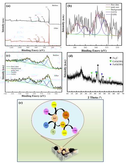 (a) XPS survey spectra for Fe@MF-12.5-800 before and after Cr(VI) reactions; (b) Cr2p XPS spectra of Fe@MF-12.5-800 after reaction; (c) Fe2p of Fe@MF-12.5-800 before and after reaction; (d) XRD of Fe@MF-12.5-800 after Cr(VI) reaction; and (e) plausible mechanism for monolayer Cr(VI) adsorption onto Fe@MF-12.5-800.