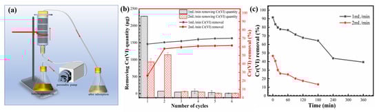 (a) Schematic diagram of Fe@MF-12.5-800 column migration experiment; (b) Cr(VI) removal efficiency for the first treatment at different flow rates; (c) Cr(VI) removal by Fe@MF-12.5-800 at different flow cycles.