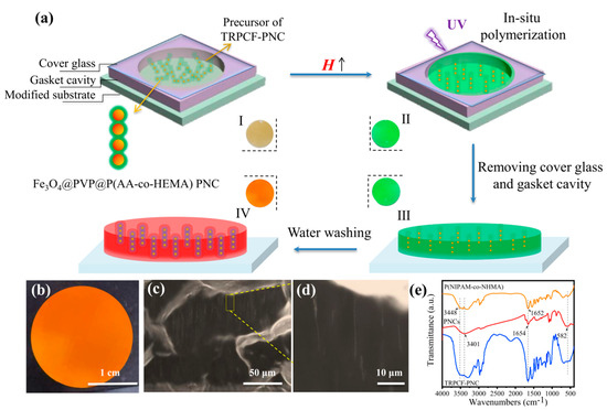 Unlike the conventional TRPCFs, a new preparation strategy is proposed here to fabricate a heterogeneous TRPCF-PNC in which Fe3O4@PVP@P(AA-co-HEMA) PNCs are used as display units. Figure 1a schematically shows the preparation process of the TRPCF-PNC as well as the digital photos corresponding to the different stages (I to IV) of the preparation process. The Fe3O4@PVP@P(AA-co-HEMA) PNCs were first fabricated according to the reported strategy [30]. The SEM image of the PNCs in Figure S1a illustrates that the colloidal particles that had an equal interparticle spacing were coated by the gel, presenting a peapod-like structure. The optical microscope images in Figure S1b,c demonstrate that the PNCs were relatively rigid, which is consistent with previous analogs [31]. Furthermore, as shown in Figure S2, the reflection spectra of these PNCs are independent of the temperature change, proving their non-temperature responsiveness. In the meantime, once aligned with the direction of the external magnetic field, the reflection peak position of the PNCs as well as their reflective intensity are almost immune to the increment in the magnetic field strength (Figure S3). During the TRPCF-PNC preparation process, a precursor solution is injected into the gasket cavity loaded onto a carbon–carbon double bond modified glass substrate and the whole sample shows a brown color (photo I). When a vertical magnetic field is applied normally to the glass substrate, the sample appears green due to the rapid alignment of PNCs along the magnetic field (photo II). Next, in situ polymerization is initiated by ultraviolet radiation, and those oriented PNCs are fixed by the surrounding thermosensitive hydrogel. The prepared TRPCF-PNC is covalently anchored on the substrate via the chemical reaction between the monomers and silane-modified glass substrate. Generally, the contraction of volume will occur when monomers transform into macromolecules, which may result in the blue shift of the embedded non-closed packed photonic crystals. However, the TRPCF-PNC still maintained the same green (III) as that of its precursor solution, which can be attributed to the prefixed periodic structure of the PNCs and shows that PNCs have sufficient mechanical strength to resist the internal stress generated during polymerization. After removing the cover glass and gasket cavity and immersing the TRPCF-PNC into deionized water to reach a swelling balance, the structural color of the rinsed TRPCF-PNC exhibited red (IV) and the reflection spectrum also red shifted (Figure S4). This phenomenon implies that after the incorporation of PNCs into the thermo-responsive matrix, the PNCs acquire thermal responsiveness.