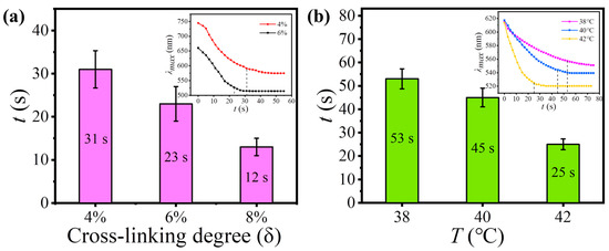 The response time of TRPCF-PNC to thermal stimulus can be conveniently tuned by employing PNCs with different mechanical strength through the change in the cross-linking degree (δ), but without varying the composition of the P(NIPAM-co-NHMA) matrix. Figure 5a gives the response times of TRPCF-PNC with different δ of the embedded PNCs when the samples were transferred from 26 °C to 44 °C. It shows that a higher δ of the PNCs produced a faster response rate for TRPCF-PNC, which is in accordance with the aforementioned mechanism. The response time of TRPCF-PNC was shorted by 2.5 times when δ increased from 4% to 8%. The curves of λmax with time in the inset, together with Figure 2d, show the cross-linking degree of the PNCs on the response time of TRPCF-PNC to thermal actuation. It proves that the PNCs at a high cross-linking degree have a stronger ability to resist the deformation from the matrix. Over time, it will become so strong in a shorter time, that the continuous shrinkage of the P(NIPAM-co-NHMA) matrix is unable to further narrow the interparticle space of the PNCs. As a result, the TRPCF embedded with PNCs at a higher cross-linking degree can exhibit a faster response to external stimulus.