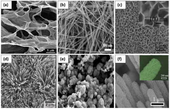 SEM images of (a) hydrothermally synthesized self-assembled graphene hydrogel (SGH) (reprinted with permission from Ref. [50]. Copyright 2010 American Chemical Society), (b) nanowire-like α-MnO2 (reprinted with permission from Ref. [51]. Copyright 2016 Elsevier), (c) flake-like mesoporous NiO (reprinted with permission from Ref. [52]. Copyright 2014 Elsevier), (d) Co3O4 nanostructures (reprinted with permission from Ref. [53]. Copyright 2011 American Chemical Society), (e) sphere-like MoO2 nanostructure (reprinted with permission from ref. [54]. Copyright 2016 Elsevier), and (f) hierarchical core–shell NiCo2O4@NiMoO4 nanowires hydrothermally grown on carbon cloth (reprinted with permission from Ref. [55]. Copyright 2015 Springer Nature).