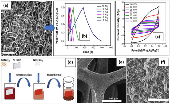 Although MnO2 nanomaterials are promising candidates for applications in SC electrodes, these materials still exhibit low conductivities, which negatively impact the electrochemical performance of electrodes during cycling and limits the commercial production of such electrodes. Therefore, Mn-based composites must be synthesized to exploit the electrochemical synergy of both the components and enhance the conductivity. Carbonaceous materials, or conducting polymers, are used mostly for fabricating hybrid MnO2 electrodes. However, carbonaceous-material-based MnO2 nanocomposites are more important owing to their large specific surface areas, high conductivities, and electric double-layer capacitances. For instance, Ning et al. hydrothermally coated MnO2 nanosheets with electrospun carbon nanofibers to synthesize a carbon nanofiber/MnO2 nanosheet composite. Owing to a unique composite hollow structure, an electrode fabricated using the composite electrode exhibited a specific capacitance of 151 F g−1 at a current density of 1 A g−1 and capacitance retention of 90% after 8000 cycles [82]. The binder-free electrode improved the overall electrochemical performance of the SC device because the electrode reduced internal resistance. Hydrothermal synthesis enabled the economic and convenient fabrication of the binder-free electrode, and the electrode facilitated both a rapid electron transfer and electrolyte penetration deep into the active material pores. Similarly, Huang et al. hydrothermally synthesized a 3D CNT@MnO2 hybrid binder-free electrode in a facile manner; it exhibited a capacitance of 325.5 F g−1 at a current density of 0.3 A g−1 and a capacitance retention of 90.5% after 5000 cycles [83]. Flexible SCs have recently attracted considerable research attention because of their widespread applications in foldable displays, wearable electronics, and other miniature portable devices. Flexible materials must exhibit high mechanical strengths and a good electrochemical performance for applications to SC electrodes [84]. In 2016, Guo et al. hydrothermally synthesized a MnO2/graphene/polyester composite in a facile manner and used it to fabricate an SC electrode. Interestingly, the MnO2 morphology was easily controlled by maintaining a constant reaction time. When swept at 2 mV s−1, the electrode exhibited a specific capacitance of 332 F g−1 [85]. All these studies indicate that hydrothermal synthesis is an easy and convenient method for fabricating manganese-based SC electrodes. Among the transition metals, iron is the most promising for applications in energy-storage devices. Owing to their improved electrochemical performance in the negative potential window, iron oxides, hydroxides, and composites have been widely investigated for fabricating SC anodes [86,87]. Furthermore, because iron is naturally abundant, inexpensive, and nontoxic, it has attracted considerable research attention for applications in SC electrodes. Moreover, iron exhibits different oxidation states because it can form many oxides, including FeO, Fe2O3, FeOOH, Fe3O4, and Fe(OH)3, the most stable of which are Fe3O4, FeOOH, and Fe2O3 [88]. In aqueous solutions, iron exists as Fe2+ and Fe3+ ions, which are highly desirable for a good electrochemical performance. Because these materials are primarily distinguished by their crystal dimensions, surface characteristics, defect chemistries, morphologies, and textures, research should be conducted to determine how these properties impact the development of rationally designed SC electrode materials to enhance the electrode’s electrochemical performance. To optimize SC electrodes, a novel synthesis method is required, and hydrothermal synthesis is the most effective method for preparing 0-, 1-, and 2-D and other promising iron oxide/hydroxide hierarchical structures [89,90]. Zhu et al. hydrothermally synthesized Fe2O3 nanoparticles for applications in SC electrodes and investigated how precursor conditions, surfactants, stabilizing agents, and reaction times affected the material electrochemical performance. The electrode material exhibited a specific capacitance of 340.5 F g−1 at a current density of 1 A g−1 [91]. Structurally stable electrode materials exhibit a good electrochemical performance during continuous charge–discharge cycling, and amorphous materials exhibiting disordered structures have proven to be advantageous when utilized as SC electrodes. Hydrothermal synthesis is also suitable for preparing amorphous porous SC electrode materials [92]. For instance, Yang et al. recently utilized one-pot hydrothermal synthesis to directly grow amorphous FeOOH on nickel foam, as shown in Figure 3d–f. The optimized electrode fabricated using the FeOOH grown at 160 °C exhibited a high specific capacitance of 1300 F g−1 at a current density of 2 A g−1.