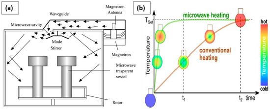 (a) Schematic representing microwave equipment and all components required for synthesizing inorganic materials (reproduced with permission from Ref. [108]. Copyright 2014 Elsevier). (b) Graph representing relationship between temperature and time for microwave-assisted and conventional heating methods (reproduced with permission from Ref. [101]. Copyright 2018 Taylor & Francis).