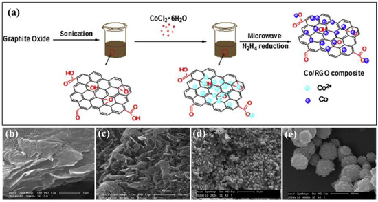 (a) Schematic illustrating formation mechanism of Co/rGO composite synthesized using microwave heating. SEM images of (b) GO, (c) rGO, (d) Co, and (e) Co/rGO-15 at different magnifications (reprinted with permission from Ref. [140]. Copyright 2015 Elsevier).