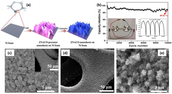 CBD is a simple and inexpensive technique for directly depositing semiconducting materials, such as MOs and metal hydroxides, on conducting substrates because it does not require high temperatures or an external electrical source [147]. Compared with hydrothermal and solvothermal syntheses, CBD enables the industrial production of the materials. During CBD, a synthesized material is precipitated from a precursor solution to a substrate surface. In CBD, substrates are dipped into a basic solution composed of precursor materials, such as metal ions, a basic medium, and a chelating agent, to release the metal ions into the solution. CBD enables a film’s thickness and composition to be controlled by adjusting a solution’s pH, temperature, and reagent concentration [112]. Owing to their nontoxicity, natural abundance, high electrochemical activity, and good electrical conductivity, zinc oxides [126] and their composites have recently sparked considerable research interest for applications to SC-electrode materials. For instance, Chebrolu et al. used simple, cost-effective CBD to synthesize ZnO-based composites to investigate the electrochemical performance of ZnO-nanowire-, ZnO/CuO-nanowire-array-, ZnO/NiO-nanosheet-, ZnO/FeO-nanocrystal-, and ZnO/PbO-nanotube-based binder-free electrodes. The synthesized materials were grown directly on a conducting substrate (i.e., Ni foam). The ZnO/NiO nanosheets exhibited the highest pseudocapacitive specific capacitance of 1248 F g−1 and the best cycling stability (79%) of all the electrodes after 3000 cycles. The simple CBD method and the synergistic contributions of the n-type ZnO and p-type NiO improved the electrochemical performance of the electrode [148]. However, the electrode materials exhibited low energy densities, which limited their industrial applications to advanced multifunctional SCs. Using hybrid SCs is an effective strategy for overcoming low-energy-density limitations, and binder-free electrodes improve a hybrid SC’s working performance. However, inexpensively producing these materials is a formidable challenge. CBD is very advantageous for rationally designing and synthesizing multicomponent-based hierarchical MO-based SC structures. For instance, Zhang et al. used CBD to synthesize self-supported porous quaternary Zn–Ni–Al–Co oxide (ZNACO) nanosheets as hybrid electrode materials for applications in SCs, as shown in Figure 6a–e. At a discharge current density of 1 A g−1, a binder-free electrode in a three-electrode configuration exhibited a specific capacitance of 839.2 C g−1. An asymmetrically configured device fabricated using ZNACO and AC as a cathode and anode, respectively, produced a high energy density of 72.4 W h kg−1 while exhibiting a remarkable power density of 533 W kg−1. After 10,000 cycles at a current density of 10 A g−1, the hybrid SC device retained 90% of its initial capacitance (Figure 6b). The good capacitive performance was attributed to the unique structural features and synergistic contributions of the four MOs. This study also revealed the potential of applying CBD to synthesize quaternary hybrid electrode materials for applications in SCs [149].