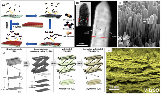 (a) Schematic of ALD steps in AB binary reaction sequence (reproduced with permission [168]). (b) TEM image of Z-N 800 and (c) SEM image of Ti/ZnO NW/Ni–NiO fabricated over 1500 ALD cycles (reprinted with permission from Ref. [169]. Copyright 2018 American Chemical Society). (d) Schematic illustrating formation of amorphous and crystalline V2O5 coated on rGO and (e) SEM image of V–rGO fabricated over 300 ALD cycles (reprinted with permission from Ref. [177]. Copyright 2020 Elsevier).