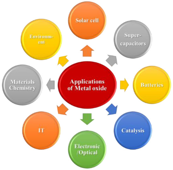EDLCs are so named because they physically store an electrostatic charge in an electric field between an adjacent electrode and electrolyte, and the charge rapidly accumulates through electrostatic attraction without any chemical reactions, which generates a high device-power density [13,14,15]. In contrast, PCs operate by faradaically storing a charge at the electrode–electrolyte interface, where the charge is actually transferred between the electrode and the electrolyte. Through reversible redox reactions involving the highly reversible formation of chemical species, PCs exhibit higher energy densities than EDLCs [16,17,18]. The main components required to fabricate a hybrid-operating SC device include electrode materials, electrolytes, separators, and current collectors [19]. Although each component is important, selecting an electrode’s material and fabricating the electrode are the most crucial aspects. Carbon-based materials are the best EDLC electrode materials because their charge-storage mechanism mainly relies on the electrode-material surface area accessible to electrolyte ions. Activated carbon (AC), graphene and its derivatives, carbon nanotubes (CNTs), and carbon aerogels have been used as EDLC electrode materials [20,21,22] because they are inexpensive, are simply fabricated, and exhibit large surface areas and wide ranges of pore-size distributions. However, owing to their low specific capacitances, carbonaceous materials do not sufficiently contribute to the high SC energy density [23]. High-capacitance electrode materials are preferentially used to overcome the low energy density. Owing to their rapid reversible surface-redox reactions, conducting polymers and metal oxides (MOs) are pseudocapacitive electrode materials that provide high energy densities to SCs [24,25,26]. Compared to MOs, conducting polymers exhibit poor structural stabilities during continuous charge–discharge cycling. Therefore, various low-cost MOs and their composite electrode materials have been identified as promising alternatives to carbonaceous materials and conducting polymers [27,28,29]. Because of their exceptional physicochemical properties, MOs have been used in several applications (Scheme 1) and are usually applied as electrode materials because they can be synthesized using a wide range of methods and because of their high theoretical specific capacitances, natural abundance, excellent pseudocapacitive behaviors, high thermal and electrochemical stabilities, and reliabilities [30,31,32,33].