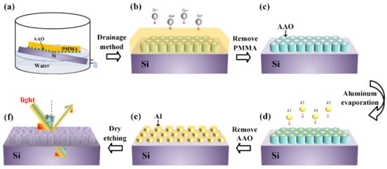The schematic diagram of the AAO thin film-based pattern replication flow: (a,b), depositing method. (b,c), PMMA removal by oxygen dry etching. (c,d), aluminum evaporation. (d,e), remove AAO. (e,f), dry etching by using the aluminum etching mask.