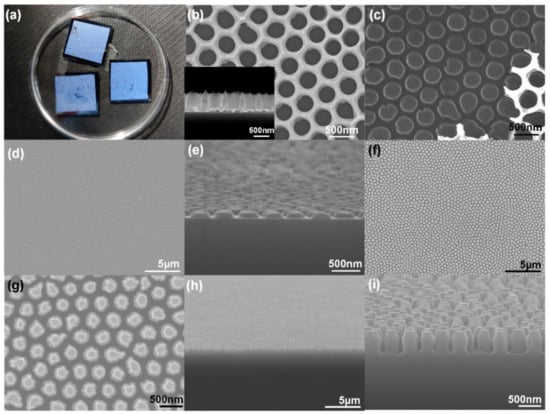 Figure 2 shows the main surface morphologies during the experiments. Several benefits of the support effect of the PMMA layer, the soft depositing and oxygen plasma dry etching processes, and the free standing through-hole AAO thin film can be obtained for a large area as shown in Figure 2a. The effective area of transferred AAO thin film is around 15 mm × 15 mm in Figure 2a. Figure 2b is the SEM image of the transferred through-hole AAO thin film on Si, and the picture in the lower left corner is a sectional view of the AAO thin film on Si, the period of the through-hole AAO is around 479 nm, the aperture is around 363 nm, the thickness of the through-hole AAO is around 540 nm, and the thickness of the through-hole AAO was chosen under the following considerations: (1) the hole inside the AAO is not absolutely vertical (e.g., Figure 2b) and the evaporation also has a certain direction which means the thinner the AAO template is, the more accurate the results will be (e.g., thick AAO will induce feature size loss during pattern replication in evaporation); (2) the surface of the AAO template is very rough while the silicon substrate is much more smooth which makes it easier for thinner AAO to touch the substrate fully []; (3) if the AAO film is too thin, it can easily be damaged during the operation. Due to these above reasons, a ~500 nm-thick through-hole AAO was used as the initial template in the experiment. After evaporation, the AAO template was torn off with tape, in Figure 2c, the white film in the lower right corner between the cracks is AAO thin film that waiting to be torn off and the black circle is Al. As shown in Figure 2c, the period of Al is around 467 nm and the aperture is around 357 nm; the dimensions of Al circles match well with those of the AAO nanoholes, which demonstrates a success in using the AAO thin film replication process. Figure 2d shows the SEM top-view of the large area uniform Al cylinder arrays in low magnification; the measurement area is around 30 μm × 30 μm. Figure 2e is the cross-sectional image of the Al arrays, the measured height of Al is around 99 nm. Figure 2f–i are the SEM images of AAO nanostructured silicon, in which Figure 2f,h are the low magnification images, Figure 2g,i are the high magnification images. As shown, the final particular structure is like putting countless cups together, so we label it CSNP. One can notice that the CSNP Si arrays are formed on the whole surface without obvious drawbacks, which proves the validity of the proposed replication method.