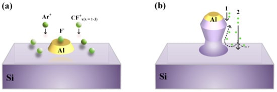 Figure 3 shows the surface morphology before and after RIE dry etching. In Figure 3a, the reactive ion etching with Ar and CF4 gas plasma was used to bombard the surface of Al nanostructure on Si. In order to ionize a gas molecule or atom to form plasma, etching gas must be used to produce glow discharge under the function of high frequency electric field. In plasma, there are positive ions (Ion+), negative ions (Ion−), radicals, and free electrons, and the active radicals are responsible for making chemical reaction with etched material. In this experiment, the positive ions (Ar+, F+, CF+, CF2+, CF3+), the negative ions (F−, CF3−) and the radicals (F, F2, CF, CF2, CF3) are included [,,]. The main reaction that takes place is as follows: