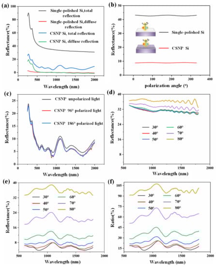 Reflectance measurement curves: (a) the curve of transmittance versus wavelength for the total reflection and diffuse reflection of single-polished Si and CSNP Si. (b) polarization-dependent measurements of the total reflection for single-polished Si and CSNP Si, with a fixed incident light wavelength of 500 nm, inserts illuminate the corresponding samples (c) wavelength-dependent total reflection measurements of the CSNP Si. (d) wavelength dependent total reflection measurements of the single-polished Si, with incident angles between 30°–80°. (e) wavelength dependent total reflection measurements of the CSNP Si, with incident angles between 30°–80°. (f) reflectance ratio calculated by using data from (e) divided by that of (d). (a–c) are the normal incidence measurements with a standard 8° incident angle.