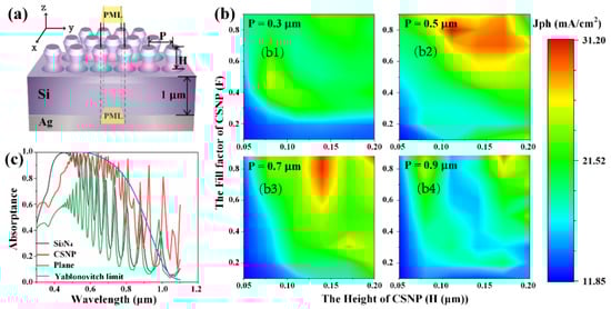 The simulation of a solar cell: (a) Simulation model of the CSNP thin film Si solar cell. (b) Relationships between the parameters of CSNP and Jph of solar cell at different periods for (b1) 0.3 μm, (b2) 0.5 μm, (b3) 0.7 μm, and (b4) 0.9 μm. Height ranges from 0.05 μm to 0.2 μm with a step size of 0.03 μm. Fill factor ranges from 0.1 to 0.9 with a step size of 0.1. (c) Absorptance calculation results for 1 μm thick solar cells under different architectures. CSNP with P = 0.5 μm, F = 0.8 and H = 0.11 μm was used and the thickness of Si3N4 has been optimized. The absorptance of Yablonovitch light capture limit of 1 μm thick c-Si was used for reference.