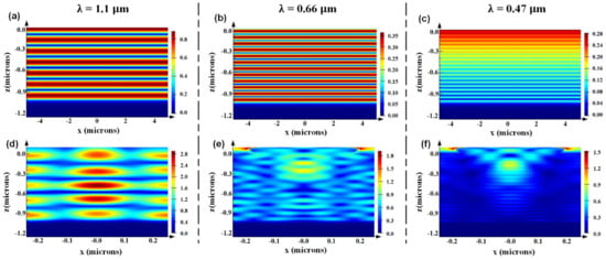 The distribution of electric field strength is shown in Figure 6. The mechanism of light capture ability of plane and CSNP solar cells were studied by their electric field at 1.1 μm, 0.66 μm and 0.47 μm. Regarding Si-based solar cells, there is a negative correlation between absorption coefficient and wavelength, as outlined above, so the absorption is relatively stronger at shorter wavelengths, which can be easily observed by comparing Figure 6a–c (or Figure 6d–f). According to the equivalent medium theory, for a long light wavelength like 1.1 μm, the light cannot distinguish the structure and will consider it as a uniform material with equivalent refractive index neff defined by Equation (3). Thus, the propagation direction of the light will not be changed, as proven by Figure 6a,d with similar electric filed distributions, which corresponds to the leaky mode and shows little help for the light-trapping enhancement. With respect to the shorter wavelengths, like 0.66 μm and 0.47 μm, the diffraction effect dominants and the diffraction angle for a normal incidence can be defined by []:
