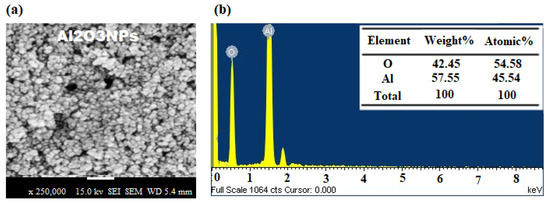 (a) SEM and (b) EDX images of biosynthesized Al2O3 nanoparticles.
