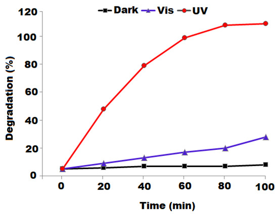 The photocatalytic degradation of MB dye in the presence of pre-synthesized Al2O3 NPs under the influence of light was studied. Three different environments (dark, UV light, and natural solar irradiation) were applied to the reaction mixture containing 5 ppm of MB and 15 mg of Al2O3 NPs. Under the dark condition, the insignificant degradation of MB dye was observed, while the photodegradation of MB was found to be much higher in the visible light irradiation and UV irradiation (Figure 5). The UV–vis spectra of the as-synthesized Al2O3 NPs supported the obtained results for the decomposition of MB under UV irradiation. The MB dye showed ~98% of degradation in 100 min under UV irradiation, whereas MY dye exhibited 96% and was noticed under similar conditions. However, around ~22% of degradation was observed in MB/MY dye under visible light in a 100 min time span.