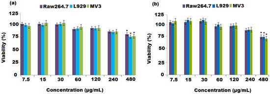 Cellular viability measurements of RAW 264.7, L929, and MV3 cancer cells after 24 h treatment with (a) grapefruit peel extract and (b) Al2O3 nanoparticles. Values are represented as cellular viability percentage and expressed as the means ± SD of three independent experiments. * Statistically significant (p < 0.05) as compared to the control cells.