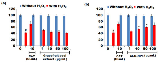 Protective effect of (a) grapefruit peels extract and (b) Al2O3 NPs in RAW 264.7 macrophages towards damage caused by hydrogen peroxide (H2O2). The results were represented as ± SD (n = 2). # Significant (p < 0.05) and * Significant (p < 0.05) compared to negative control without H2O2 and H2O2 control by one-way ANOVA.