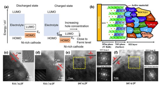 The LUMO levels of transition metal ions in Ni-rich cathode materials are lower than that of other active materials, which will accelerate the oxidation of electrolytes. The energy for the transition metal (TM) 3d–O 2p antibonding hybrid orbital is equivalent to the LUMO energy level of the hole. As shown in Figure 2a [30], during the charging process, the Fermi level of the Ni-rich cathode is close to the HOMO level of the electrolyte. Additionally, the hole concentration in the charged state increases rapidly, resulting in the oxidation of the electrolyte. Figure 2b shows the CEI film formed on the surface of Ni-rich cathode [31], the inorganic components act as the “inner layer” of the CEI film and closely adhere to the electrode surface, the organic components are located at the outer layer of the CEI film, Manthiram et al. [32] also proved it by Time-of-flight secondary-ion mass spectrometry (ToF-SIMS). The CEI film is mainly composed of Li2CO3, alkyl carbonate and LixPOyFz oxidized from the electrolyte. Due to the presence of unstable Ni4+ with a high oxidation state on the surface of the cathode material, electrolyte oxidation occurs easily to form a thick CEI film. The lithium-ion conductivity of the CEI film is relatively poor, resulting in local resistance increases and performance degradation [31]. Thus, further research is necessary to form CEI films that possess high stability and ionic conductivity.