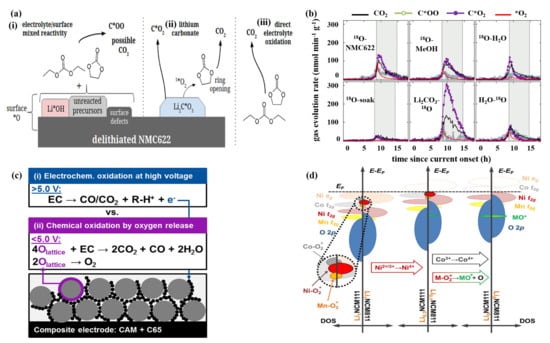 The reaction of gas release in the battery is usually exothermic, which will cause a series of subsequent chain reactions, and ultimately lead to the occurrence of dangerous accidents. In Ni-rich cathode materials, there are three reasons for gas generation, as shown in Figure 3a [39]. The first reason, “surface *O” indicates that the oxygen is from the surface of the NCM622 oxide or oxygen-containing impurities originally present on the surface (for example, Li*OH and Li2C*O3), and “O” indicates that the oxygen is from the electrolyte. It has been considered that due to the existence of surface defects such as lithium vacancies, surface hydroxides and unreacted precursors, the mixed reactions between the electrode and electrolyte would generate carbon dioxide C*OO. Second, the decomposition of Li2C*O3 also leads to the increase of C*O2, and Li2C*O3 reacts with the electrolyte to release more carbon dioxide. Third, the direct electrochemical oxidation of the ethylene carbonate (EC)/diethyl carbonate (DEC) electrolyte also gives rise to CO2. Gasteiger et al. [40] have found that the lattice oxygen released from Ni-rich cathode materials reacts with the electrolyte to release CO2 and CO gases at a voltage less than 5 V. In this case, the oxidation rate of the electrolyte is determined by the surface area of the active electrode material and the conductive carbon. When the voltage is above 5 V, the electrolyte would undergo direct electrochemical oxidation reaction for gas evolution. Furthermore, the authors propose two mechanisms to explain electrolyte oxidation (Figure 3c): (1) Electrochemical oxidation of the electrolyte; and (2) Chemical oxidation of the electrolyte caused by the release of lattice oxygen. This work presents two unique oxidation mechanisms for the electrolyte, which also shows that further research is necessary to better understand the complexity of the gas production mechanism [40].