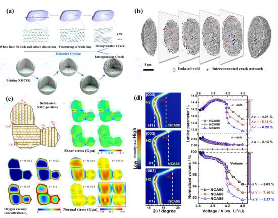 - Mao, Y.; Wang, X.; Xia, S.; Zhang, K.; Wei, C.; Bak, S.; Shadike, Z.; Liu, X.; Yang, Y.; Xu, R.; et al. High-Voltage Charging-Induced Strain, Heterogeneity, and Micro-Cracks in Secondary Particles of a Nickel-Rich Layered Cathode Material. Adv. Funct. Mater. 2019, 29, 1900247. [Google Scholar] [CrossRef]